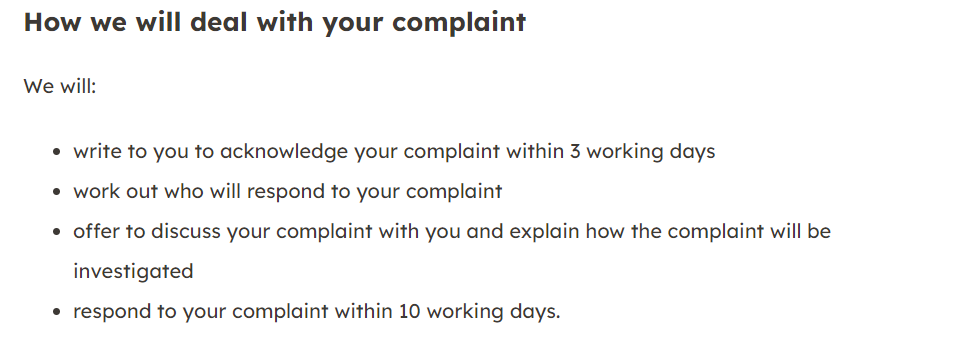 'respond to your complaint within 10 working days'as 10 from the date the complaint was made.