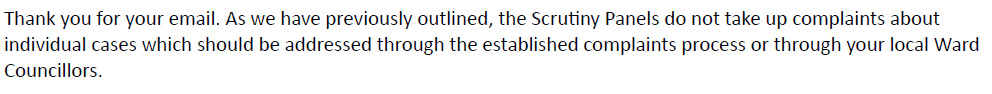 The Adult Social Care Scrutiny Committee have refused to deal with the issue of the wrong template citing it as an individual complaint and they are unable assist.