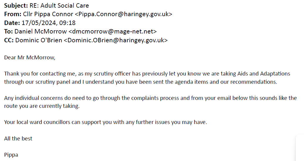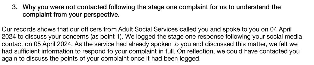Again have doubled down os the not our problem naritive. Ignoring the fact Adult Social Care are not following the procedure.